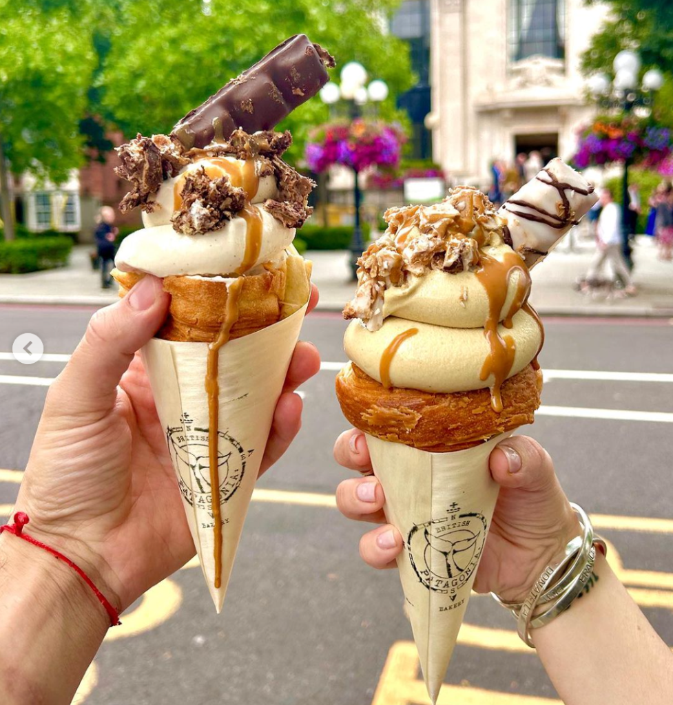 Satisfy your sweet tooth with croissant ice cream sandwiches filled with flavors like chocolate and vanilla, topped with hazelnut praline, pistachio, or chocolate flakes. Prices start at £9, available from 12 p.m. onwards at their North London store.